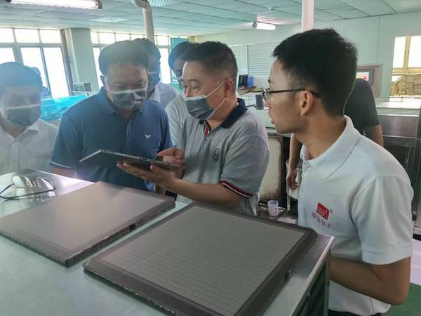 随后,梁董带领肖副市长等领导一同参观生产车间,在现场参观过程中,梁董一路仔细地向各位领导介绍固电生产的产品,肖副市长不禁感慨电子元器件的精妙之处。